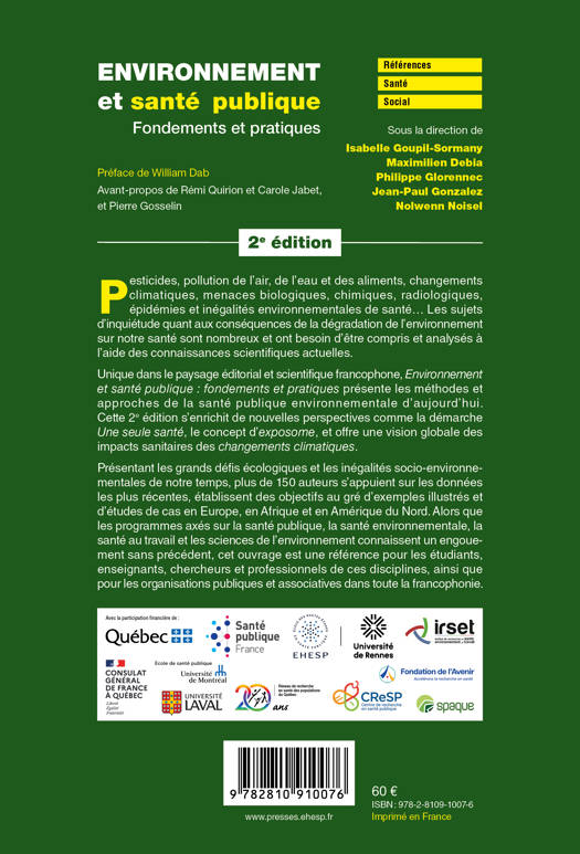 Pesticides, pollution de l’air, de l’eau et des aliments, changements climatiques, menaces biologiques, chimiques, radiologiques, épidémies et inégalités environnementales de santé… Les sujets d’inquiétude quant aux conséquences de la dégradation de l’environnement sur notre santé sont nombreux et ont besoin d’être compris et analysés à l’aide des connaissances scientifiques actuelles. Unique dans le paysage éditorial et scientifique francophone, Environnement et santé publique : fondements et pratiques présente les méthodes et approches de la santé publique environnementale d’aujourd’hui. Cette 2e édition s’enrichit de nouvelles perspectives comme la démarche Une seule santé, le concept d’exposome, et offre une vision globale des impacts sanitaires des changements climatiques. Présentant les grands défis écologiques et les inégalités socio-environnementales de notre temps, plus de 150 auteurs s’appuient sur les données les plus récentes, établissent des objectifs au gré d’exemples illustrés et d’études de cas en Europe, en Afrique et en Amérique du Nord. Alors que les programmes axés sur la santé publique, la santé environnementale, la santé au travail et les sciences de l’environnement connaissent un engouement sans précédent, cet ouvrage est une référence pour les étudiants, enseignants, chercheurs et professionnels de ces disciplines, ainsi que pour les organisations publiques et associatives dans toute la francophonie.