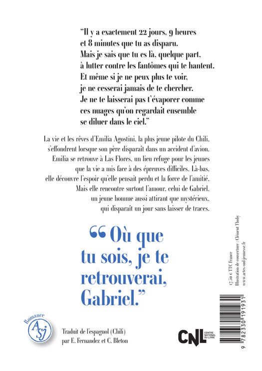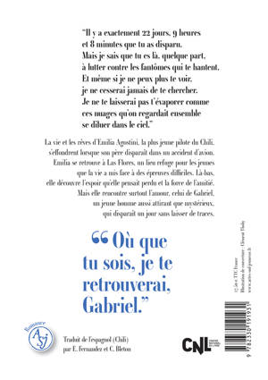 "Il y a exactement 22 jours, 9 heures et 8 minutes que tu as disparu. Mais je sais que tu es là, quelque part, à lutter contre les fantômes qui te hantent. Et même si je ne peux plus te voir, je ne cesserai jamais de te chercher. Je ne te laisserai pas t'évaporer comme ces nuages qu'on regardait ensemble se diluer dans le ciel."