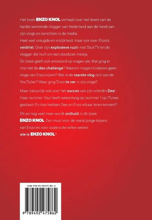 Het boek ENZO KNOL verhaalt over het leven van de hardst werkende vlogger van Nederland aan de hand van vlogs en berichten in de media. Heel veel vreugde en vrolijkheid, maar ook over Enzo's verdriet. Over zijn explosieve ruzie met StukTV en de vlogger die huilt om een doodziek meisje. Dit boek geeft ook antwoord op vragen als: Wat ging er met de deo challenge? Waarom mogen kinderen geen vlogs van Enzo kijken? Wat is de raarste vlog ooit van de YouTuber? Waar ging Enzo te ver in zijn vlogs? Maar natuurlijk ook over het succes van zijn vriendin Dee! Haar nummer You! heeft wekenlang op nummer 1 op iTunes gestaan! En hoe hebben Dee en Enzo elkaar leren kennen? Dit en nog veel meer wordt onthuld in dit boek ENZO KNOL. Een must voor de veelal jonge kijkers van Enzo en voor ouders die willen weten: wie is ENZO KNOL?