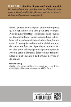 Il n’est jamais trop tard pour philosopher parce qu’il n’est jamais trop tard pour être heureux. À ceux qui promettent le bonheur dans l’avenir ou dans un ailleurs, Épicure répond que le bonheur est possible maintenant, dans la présence à soi ; à ceux qui condamnent le plaisir au nom de la morale, Épicure répond que le plaisir est un bien pour celui qui prendra plaisir à penser.