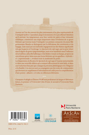 À la suite d’une introduction sur Ausone sont présentées les trois œuvres qui font l’objet de cette édition : les Epigrammata, la Bissula et le Ludus septem sapientum. Les éditeurs ont choisi de présenter la structure, les contenus et le style de ces œuvres, avec une attention particulière pour leurs rapports avec les modèles et avec la tradition culturelle. Pour chacune des trois œuvres, on retrouve le texte latin, la traduction française et des notes de commentaire. L’édition du texte présente plusieurs nouveautés par rapport aux éditions précédentes : elle bénéficie de la contribution d’un manuscrit jusqu’à présent négligé et plusieurs passages auparavant corrompus du Ludus et d’une dizaine d’épigrammes publiés dans une forme lisible et fiable.
