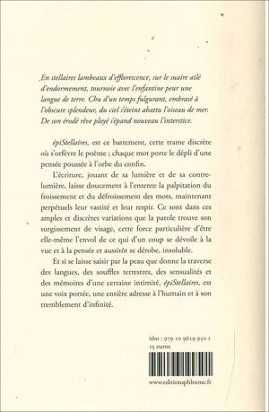 Et si se laisse saisir par la peau que donne la traverse des langues, des souffles terrestres, des sensualités et des mémoires d'une certaine intimité, épiStellaires, est une voix portée, une entière adresse à l'humain et à son tremblement d'infinité.