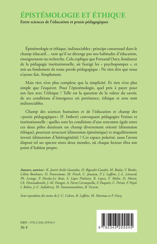 Épistémologie et éthique, indissociables: principe consensuel dans le champ éducatif... tant qu'il ne dérange pas nos habitudes d'éducation, enseignement ou recherche. Cela explique que Fernand Oury, fondateur de la pédagogie institutionnelle, ait fustigé les psychopompes, et mis au fondement de toute parole pédagogique: Ne rien dire que nous n'ayons fait. Simplement. Mais rien n'est plus complexe que la simplicité. Et rien n'est plus simple que l'esquiver. Pour l'épistémologie, quel prix à payer pour son lien avec l'éthique ? Telle est la question de la valeur du savoir, de ses conditions d'émergence où pertinence, éthique et sens sont indissociables. Champ des sciences humaines et de l'éducation et champ des praxis pédagogiques (F. Imbert) convoquant pédagogies Freinet et institutionnelle: quelles sont les conditions d'une rencontre égale entre ces deux pôles dessinant un champ diversement orienté (dimension éthique), pourtant structuré (dimension épistémique) et singulièrement investi (dimension d'hétérogénéité) ? Cet espace polarisé, nous l'avons disposé tel un spectre entre deux mondes, où chaque lecteur élira son point d'habitat propre.