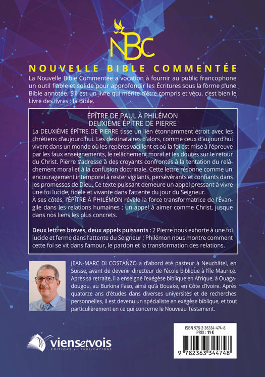 ÉPÎTRE DE PAUL À PHILÉMON / DEUXIÈME ÉPÎTRE DE PIERRE La Deuxième Épître de Pierre tisse un lien étonnamment étroit avec les chrétiens d'aujourd'hui. Les croyants d'alors, tout comme ceux d'aujour- d'hui, évoluent dans un monde où les repères vacillent et où la foi est mise à l'épreuve par les faux enseignements, le relâchement des moeurs et les doutes quant au retour du Christ. Pierre s'adresse à une Église confrontée à la tentation de céder à l'indifférence morale et à la confusion doctrinale. Cette lettre résonne comme un encouragement intemporel à rester vigilants, persévérants et confiants dans les promesses de Dieu. Ce texte puissant demeure un appel pressant à vivre une foi lucide, fidèle et vivante dans l'attente du jour du Seigneur. À ses côtés, l'Épître à Philémon révèle la force transformatrice de l'Évangile dans les relations humaines : un appel à aimer comme Christ, jusque dans nos liens les plus concrets. Deux lettres brèves, deux appels puissants : 2 Pierre nous exhorte