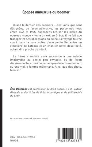 Quand le dernier des boomers - c’est ainsi que sont désignées, de façon péjorative, les personnes nées entre 1945 et 1965, supposées refuser les idoles du nouveau monde - tente un exil en Grèce, il ne fait que transporter ses obsessions au soleil. Le voyage tourne court dans la baie isolée d’une petite île, entre un cimetière de bateaux et un chantier naval désaffecté, autant dire proche du néant. Le héros immobile aura succombé à une naïade impitoyable au destin peu enviable, bu de façon déraisonnable, croisé de pathétiques fêtards milléniaux ou une vieille femme mélomane. Ainsi que des chats, bien sûr.