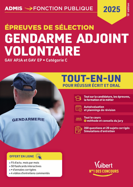 une journée de travail type d’un GAV, des témoignages, une présentation des épreuves ; uneauto-évaluation pour personnaliser vos révisions ; desplannings de révisions pour organiser votre préparation ; uneméthodepas à pas avec les bons reflexes à adopter ; lesconnaissances indispensables à maîtriser ; + de350 QCM et exercices d'entraînementcorrigés pour s'exercer ; 20 sujets blancs corrigés dans la perspective et avec les exigences du concours pour vous entraînerOFFERT en ligne :
