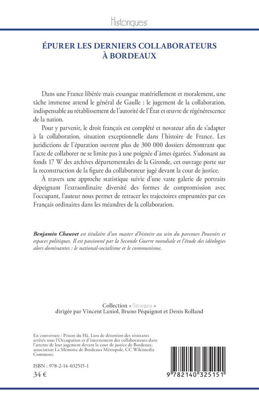 Dans une France libérée mais exsangue matériellement et moralement, une tâche immense attend le général de Gaulle : le jugement de la collaboration, indispensable au rétablissement de l'autorité de l'État et uvre de régénérescence de la nation. Pour y parvenir, le droit français est complété et novateur afin de s'adapter à la collaboration, situation exceptionnelle dans l'histoire de France. Les juridictions de l'épuration ouvrent plus de 300 000 dossiers démontrant que l'acte de collaborer ne se limite pas à une poignée d'âmes égarées. S'adossant au fonds 17 W des archives départementales de la Gironde, cet ouvrage porte sur la reconstruction de la figure du collaborateur jugé devant la cour de justice. À travers une approche statistique suivie d'une vaste galerie de portraits dépeignant l'extraordinaire diversité des formes de compromission avec l'occupant, l'auteur nous permet de retracer les trajectoires empruntées par ces Français ordinaires dans les méandres de la collaboration.