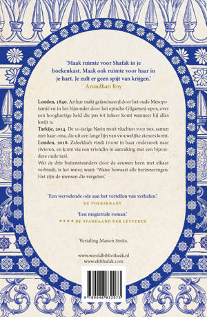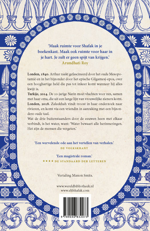 'Haar nieuwe en wellicht ook meest ambitieuze roman tot nu toe' De Morgen 'Maak ruimte voor Shafak in je boekenkast. Maak ook ruimte voor haar in je hart. Je zult er geen spijt van krijgen.' Arundhati Roy Londen, 1840. Arthur raakt gefascineerd door het oude Mesopotamië en in het bijzonder door het epische Gilgamesj-epos, over een hooghartige held die pas tot inkeer komt wanneer hij alles kwijt is. Turkije, 2014. De 10-jarige Narin moet vluchten voor isis, samen met haar oma, die uit een lange lijn van vrouwelijke zieners komt. Londen, 2018. Zaleekhah vindt troost in haar onderzoek naar rivieren, en komt via een vriendin in aanraking met een bijzondere oude taal. Wat de drie buitenstaanders door de eeuwen heen met elkaar verbindt, is het water, want: 'Water bewaart alle herinneringen. Het zijn de mensen die vergeten.' 'Een verloren gedicht, twee grote rivieren en drie opmerkelijke levens worden met elkaar verbonden door een enkele druppel water in Shafaks magistrale nieuwe roman.' **** De Standaard der Letteren 'Een van de belangrijkste schrijvers van dit moment.' Independent 'Iedereen zou Shafak moeten lezen.' The Guardian 'Een buitengewone roman, fris en zuiverend als de regen die op het metalen dak van ons leven slaat.' Column McCann 'Een meesterwerk.' Ruth Ozeki 'Shafaks verbeeldingskracht is een wonder: gedurfd, weergaloos en wijs.' Katie Kitamura 'Een moderne klassieker. Shafak is een van de grote schrijvers van onze tijd. Deze roman is verbazingwekkend, ingenieus en prachtig.' Peter Frankopan