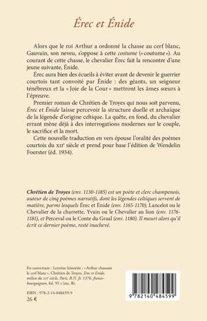Alors que le roi Arthur a ordonné la chasse au cerf-blanc, Gauvain, son neveu, s'oppose à cette costume ( coutume ). Au courant de cette chasse, le chevalier Érec fait la rencontre d'une jeune suivante, Énide. Érec aura bien des écueils à éviter avant de devenir le guerrier courtois tant convoité par Énide: des géants, un seigneur ténébreux et la Joie de la Cour mettront les âmes soeurs à l'épreuve. Premier roman de Chrétien de Troyes qui nous soit parvenu, Érec et Énide laisse percevoir la structure duelle et archaïque de la légende d'origine celtique. La quête, en fond, du chevalier errant mène déjà à des interrogations modernes sur le couple, le sacrifice et la mort. Cette nouvelle traduction en vers épouse l'oralité des poèmes courtois du XIIe siècle et prend pour base l'édition de Wendelin Foerster (éd. 1934).