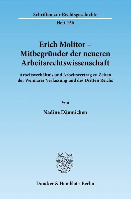 Nadine Däumichen beschäftigt sich mit Leben und Werk von Erich Molitor. Der erste, biografische Teil der Arbeit ist Molitors Lebensgeschichte gewidmet. Der zweite Teil bildet den Mittelpunkt der Untersuchung. Hier werden Molitors Ansätze zum Arbeitsrecht, die Entwicklung des Arbeitnehmerbegriffs zu Zeiten der Weimarer Verfassung und das Einzelarbeitsverhältnis im Verhältnis zum zivilrechtlichen Vertragsbegriff während der Weimarer Zeit und zu Zeiten des Nationalsozialismus aufgezeigt. Die von Molitor vertretene Theorie von der Einordnung des Arbeitnehmers in den Betrieb des Arbeitgebers sowie der Streit zur Begründung eines Arbeitsverhältnisses werden näher untersucht.