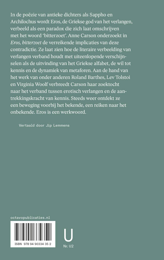 In de poëzie van antieke dichters als Sappho en Archilochus wordt Eros, de Griekse god van het verlangen, verbeeld als een paradox die zich laat omschrijven met het woord ‘bitterzoet’. Anne Carson onderzoekt in Eros, bitterzoet de verreikende implicaties van deze contradictie. Ze laat zien hoe de literaire verbeelding van verlangen verband houdt met uiteenlopende verschijnselen als de uitvinding van het Griekse alfabet, de wil tot kennis en de dynamiek van metaforen. Aan de hand van het werk van onder anderen Roland Barthes, Lev Tolstoi en Virginia Woolf verbreedt Carson haar zoektocht naar het verband tussen erotisch verlangen en de aantrekkingskracht van kennis. Steeds weer ontdekt ze een beweging voorbij het bekende, een reiken naar het onbekende. Eros is een werkwoord.