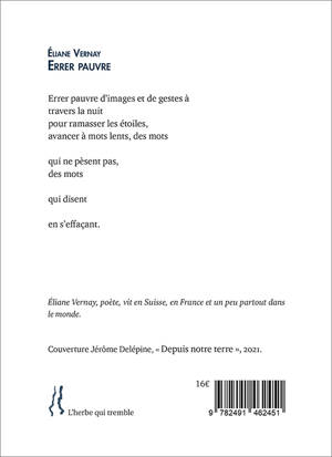 Récit d’une vie qui veut naître...Tâtonnant, cherchant une parole après le cri qui n’a pas jailli, Errer pauvre est un long poème « qui va et vient, avance et recule ou s’égare un peu parfois, ou peut-être souvent, mais n’est-ce pas la vie qui veut ça ? », nous dit l’auteure.