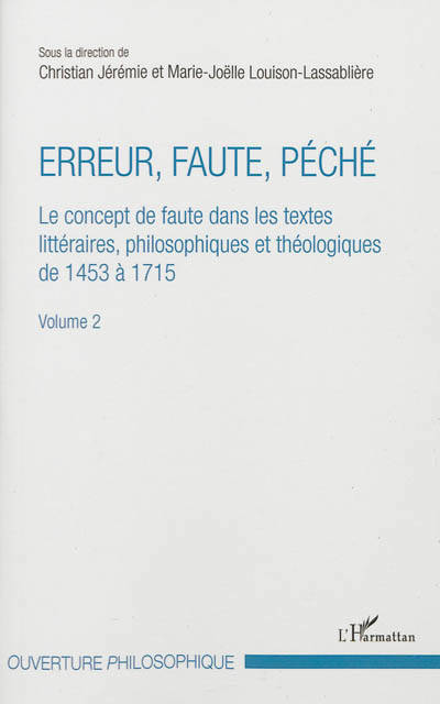 Mea culpa, mea culpa, mea maxima culpa : phraséologie liturgique ou expression d'un sentiment de culpabilité qui taraude l'espèce humaine depuis la nuit des temps ? La faute est inscrite dans le parcours de l'homme et soulève maintes questions sur sa responsabilité, son rapport au monde, sa subordination à Dieu ou à Satan. À chaque époque sa réponse. Pour la période comprise entre 1453 et 1715, ont été convoqués les courants philosophiques et religieux, les écrits polémiques ou techniques pour affiner le concept de faute en l'opposant le cas échéant à l'erreur et au péché.