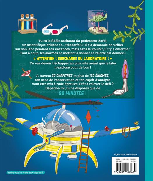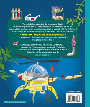 Un Escape Book de 144 pages et de 120 énigmes à résoudre avec, pour certaines, un filtre rouge qui révèle toutes sortes d'infos et d'indices pour guider le lecteur de façon ludique. Thématique : le laboratoire du professeur Zarbi (un scientifique génial et farfelu). 20 grandes parties avec 20 salles dont il faut s'échapper. Plusieurs parcours sont proposés selon le premier passage que le lecteur va choisir d'emprunter. 3 issues possibles pour sortir du bâtiment abritant le laboratoire. Un temps donné : 90 minutes par parcours, soit pour 6 salles environ. Besoin d'un chronomètre ou d'une montre pour noter son temps de progression. 120 énigmes de logique, d'observation, de casse-tête visuels, etc. Livre rejouable. En fin d'ouvrage : les solutions.