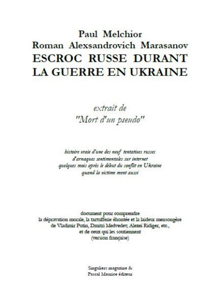 Histoire vraie d'une des neuf tentatives russes d'arnaques sentimentales sur internet quelques mois après le début du conflit en Ukraine quand la victime ment aussi... document pour comprendre la dépravation morale, la tartufferie éhontée et la laideur mensongère de Vladimir Putin, Dmitri Medvedev, Alexeï Ridiger, etc., et de ceux qui les soutiennent (version française).