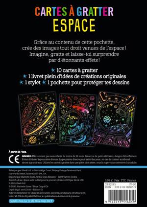 Une pochette contenant 10 cartes à gratter sur le thème de l'espace, un stylet et un livret de 16 pages avec des modèles et des conseils pour aider l'enfant à réaliser ses cartes. En grattant les cartes à l'aide du stylet, l'enfant révèle de jolies couleurs.