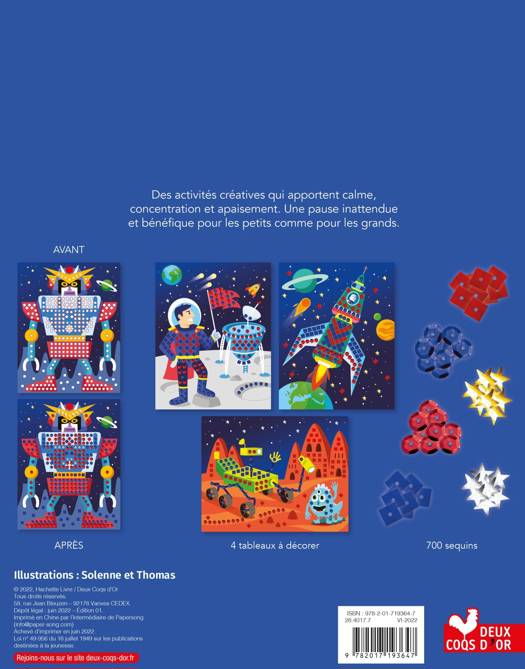 Une pochette sur le thème de l'espace contenant 4 tableaux à compléter et à décorer à l'aide d'environ 600 sequins et de petites étoiles de différentes couleurs. Une activité ludique et créative !