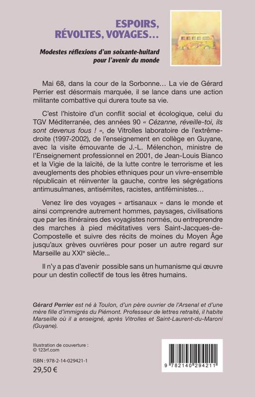 Mai 68, dans la cour de la Sorbonne... La vie de Gérard Perrier est désormais marquée, il se lance dans une action militante combattive qui durera toute sa vie. C'est l'histoire d'un conflit social et écologique, celui du TGV Méditerranée, des années 90 « Cézanne, réveille-toi, ils sont devenus fous ! », de Vitrolles laboratoire de l'extrême- droite (1997-2002), de l'enseignement en collège en Guyane, avec la visite émouvante de J.-L. Mélenchon, ministre de l'Enseignement professionnel en 2001, de Jean-Louis Bianco et la Vigie de la laïcité, de la lutte contre le terrorisme et les aveuglements des phobies ethniques pour un vivre-ensemble républicain et réinventer la gauche, contre les ségrégations antimusulmanes, antisémites, racistes, antiféministes... Venez lire des voyages « artisanaux » dans le monde et ainsi comprendre autrement hommes, paysages, civilisations que par les itinéraires des voyagistes normés, ou entreprendre des marches à pied méditatives vers Saint-Jacques-de- Compostelle et suivre des récits de moines du Moyen Âge jusqu'aux grèves ouvrières pour poser un autre regard sur Marseille au XXIe siècle... Il n'y a pas d'avenir possible sans un humanisme qui oeuvre pour un destin collectif de tous les êtres humains.