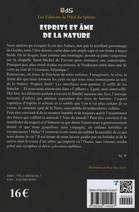Nous aurions pu évoquer le roi des Aulnes, non pas le terrifiant personnage de Goethe, mais l'être discret, caché dans son ample cape et son feutre à larges bords. Ou le dragon, haut comme une montagne, posant sa patte vengeresse sur la chapelle Saint-Michel de Fuveau pour annoncer une catastrophe. Pourquoi pas, plus irréel et plus mystérieux, le Verdoyant retiré dans une île verte au sein de l'écumeux Atlantique ? Retrouvons, en nous, la fraîcheur de notre enfance, l'imaginaire, le rêve, la féerie dès que nous fermons les yeux ou que nous nous immergeons au sein de la Nature. Propice forêt ! Les interfaces sont partout, il suffit de les franchir... Et nous nous retrouvons dans l'ailleurs . Égaré, mais émerveillé. Dès lors, les éléments parlent à travers la fluidité aqueuse des fées, l'ancrage terrestre d'arbres qui abritent cependant des êtres de lumière, l'aspect vaporeux d'esprits si aériens et si subtils que l'on n'est plus certain de sa vision, le caractère igné de la Terre, susceptible de tentaculaires colères. Peut-être convient-il de se montrer humble et de toujours quérir l'assentiment des forces qui veillent et animent l'Âme du monde ? Peut-être convient-il de manifester du respect et d'honorer ce que dame Nature nous a généreusement donné et que nous gaspillons sans vergogne, en enfants terribles et irrespectueux ? Hélas ! Comment avons-nous pu oublier la sacralité de ce qui nous donne la vie ? Il est temps de nous laisser guider par un farfadet et de le suivre dans le creux d'un arbre, qu'importe où ? Osons, sans retenue, rendre grâce aux nymphes et dévis sylvestres oubliées...