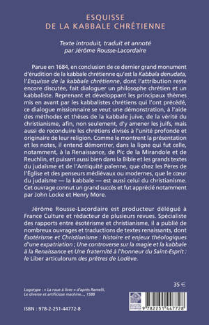 Parue en 1684, en conclusion de ce dernier grand monument d'erudition de la kabbale chretienne qu'est la Kabbala denudata, l'Esquisse de la kabbale chretienne, dont l'attribution reste encore discutee, fait dialoguer un philosophe chretien et un kabbaliste. Reprenant et developpant les principaux themes mis en avant par les kabbalistes chretiens qui l'ont precede, ce dialogue missionnaire se veut une demonstration, a l'aide des methodes et theses de la kabbale juive, de la verite du christianisme, afin, non seulement, d'y amener les juifs, mais aussi de reconduire les chretiens divises a l'unite profonde et originaire de leur religion. Comme le montrent la presentation et les notes, il entend demontrer, dans la ligne qui fut celle, notamment, a la Renaissance, de Pic de la Mirandole et de Reuchlin, et puisant aussi bien dans la Bible et les grands textes du judaisme et de l'Antiquite paienne, que chez les Peres de l'Eglise et des penseurs medievaux ou modernes, que le coeur du judaisme - la kabbale - est aussi celui du christianisme. Cet ouvrage connut un grand succes et fut apprecie notamment par John Locke et Henry More.