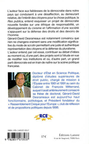 L'auteur face aux faiblesses de la démocratie dans notre pays qui conduisent à une désaffection, au demeurant relative, de l'intérêt des citoyens pour la chose publique, la Res publica, entend esquisser un projet de démocratie nouvelle fondée sur une éthique de responsabilité, un développement du civisme et l'affirmation d'une société s'appuyant sur la défense des droits et des devoirs de l'homme. Gérard-David Desrameaux est notamment convaincu que rien ne changera vraiment sans une modification significative du mode de scrutin permettant une juste et authentique représentation des citoyens et la défense du pluralisme. L'auteur entend, par cet essai, contribuer au débat d'idées au moment où, d'une part, des projets sont à l'étude en vue de modifier nos institutions et où, d'autre part, un grand parti démocrate est en train de naître sur la scène politique française.