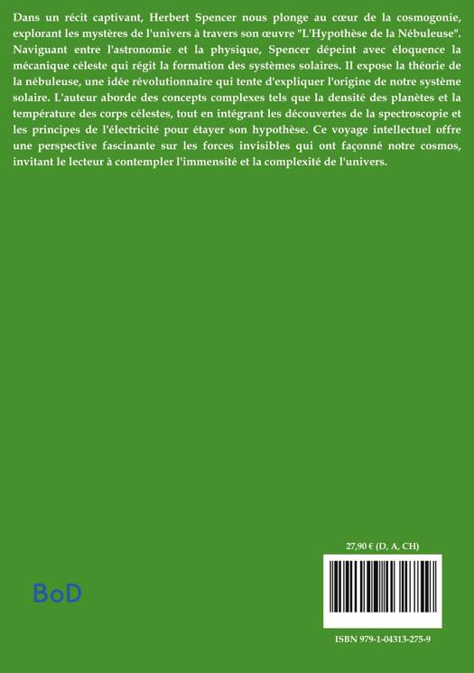 Dans un récit captivant, Herbert Spencer nous plonge au coeur de la cosmogonie, explorant les mystères de l'univers à travers son oeuvre "L'Hypothèse de la Nébuleuse". Naviguant entre l'astronomie et la physique, Spencer dépeint avec éloquence la mécanique céleste qui régit la formation des systèmes solaires. Il expose la théorie de la nébuleuse, une idée révolutionnaire qui tente d'expliquer l'origine de notre système solaire. L'auteur aborde des concepts complexes tels que la densité des planètes et la température des corps célestes, tout en intégrant les découvertes de la spectroscopie et les principes de l'électricité pour étayer son hypothèse. Ce voyage intellectuel offre une perspective fascinante sur les forces invisibles qui ont façonné notre cosmos, invitant le lecteur à contempler l'immensité et la complexité de l'univers.