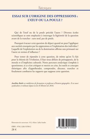 Qui de l'oeuf ou de la poule précède l'autre ? Diverses écoles scientifiques se sont employées à interroger la légitimité de la question avant de la trancher: sans oeuf, pas de poule. Pourquoi évacuer cette question de départ quand on peut l'appliquer aux sociétés marquées par les oppressions et l'exploitation des individus ? Laquelle de l'exploitation ou de la domination affirme une primauté sur l'autre en termes d'influence ? Pour tenter de répondre à cette question, de même qu'on l'a fait pour la théorie de l'évolution, il faut nous défaire de présupposés, de la morale et d'implicites culturels. Notre parcours analytique s'emploie à questionner, si ce n'est critiquer et mettre en crise, les outils et concepts théoriques afin d'appréhender, comprendre, discuter, trancher et finalement combattre les rapports que suppose cette question.