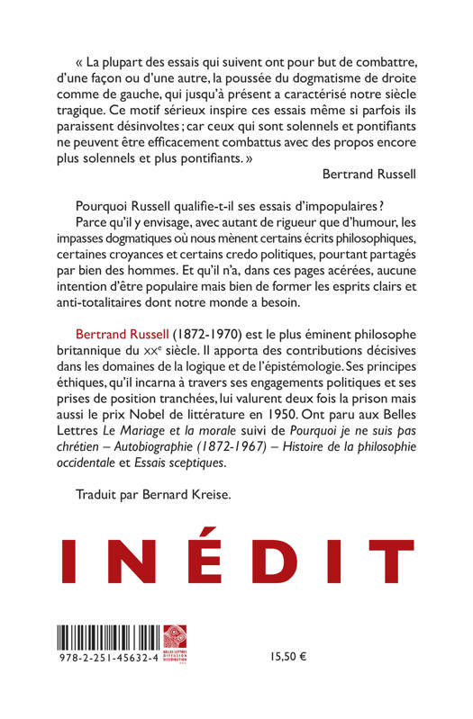 Pourquoi Russell qualifie-t-il ses essais d’impopulaires ? Parce qu’il y envisage, avec autant de rigueur que d’humour, les impasses dogmatiques où nous mènent certains écrits philosophiques, certaines croyances et certains credo politiques, pourtant partagés par bien des hommes. Et qu’il n’a, dans ces pages acérées, aucune intention d’être populaire mais bien de former les esprits clairs et anti-totalitaires dont notre monde a besoin.