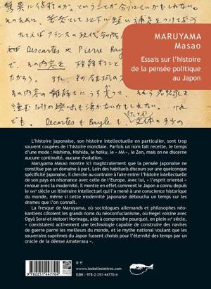 L'histoire japonaise, son histoire intellectuelle en particulier, sont trop souvent coupees de l'histoire mondiale. Parfois un nom fait recette, le temps d'une mode: Mishima, Nishida, le haiku, le MA , le Zen, mais on ne discerne aucune continuite, aucune evolution.Maruyama Masao montre ici magistralement que la pensee japonaise ne constitue pas un domaine a part. Loin des habituels discours sur une quelconque specificite japonaise, il cherche au contraire a faire entrer l'histoire intellectuelle de son pays en resonance avec celle de l'Europe. Avec lui, l'esprit oriental renoue avec la modernite. Il montre en effet comment le Japon a connu depuis le XVIIe siecle un itineraire intellectuel qui l'a mene a une conscience historique du monde, meme si cette modernite japonaise deboucha un temps sur les drames que l'on connait.La fresque de Maruyama, ou sociologues allemands et philosophes neokantiens cotoient les grands noms du neoconfucianisme, ou Hegel voisine avec Ogyu Sorai et Motoori Norinaga, aide a comprendre pourquoi, en plein XXe siecle, coexistaient activement une technologie capable de construire des navires de guerre parmi les meilleurs du monde, et le mythe national voulant que les souverains supremes du Japon fussent choisis pour l'eternite des temps par un oracle de la deesse Amaterasu .