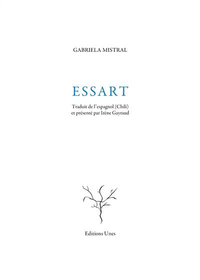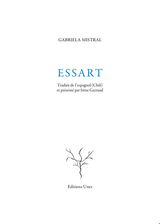 Quelle est cette terre que Gabriela Mistral cherche à essarter, à défricher ? Celle de son Chili natal, de la Cordillère des Andes, des légendes Mayas ? Ou la terre des exils et des ombres ? Essart est un livre mystérieux ; on lit ces poèmes comme on marche sur une terre ouverte, dont on embrasse les sommets du regard, cheminant au plus près d’une parole dense et profonde, rustique et mystique. Gabriela Mistral hisse ses poèmes vers la fable, au moyen d’une langue bruissante d’hommes et de dieux, de traditions et de légendes, de dialectes archaïques. Nous sommes séparés, Mistral nous rassemble dans la circulation interne d’un pouls, d’un sang à la pulsation puissante qui a le mouvement d’un fleuve. On se perd dans un « hallali de pierres roulées », au milieu des iguanes et des tortues, des cerfs et des colombes, avec cette étrange impression d’être « toujours blessé, jamais chassé ». Essart opère une transfiguration de l’enfance en odeurs, des fantômes en brumes, des hommes en paysages, des visages en fables, des peuples en fleuves, des corps en zodiaques et des dieux en rêves, en une lumière qui mystifie tout. Dans ces poèmes où vivre et mourir, dans cette confession plus vaste que soi, des profusions de monde aux « quarante points cardinaux » tiennent dans un mot, dans une langue habitée, c’est à dire peuplée de souvenirs, de charmes, de fleuves, d’oiseaux et de fleurs, de disparitions et d’esprits, vaste comme un horizon ou un ciel étoilé. Cette voix qui nous soulève vers la liberté, nous berce entre les épiphanies et les pleurs avec « le pur rythme tranquille des vieilles étoiles » semble ne jamais vouloir interrompre son chant, ne jamais briser le sortilège et c’est ce qui nous tient, nous emmaillote à ces lignes : la crainte d’une magie dissipée, le retour brutal sur la terre vide et nue, inconsolables de la fable. Aussi nous ne quittons ni les anges, ni le rêve de cette poésie qui « regarde le monde aussi familièrement que si elle l’avait créé. »