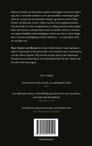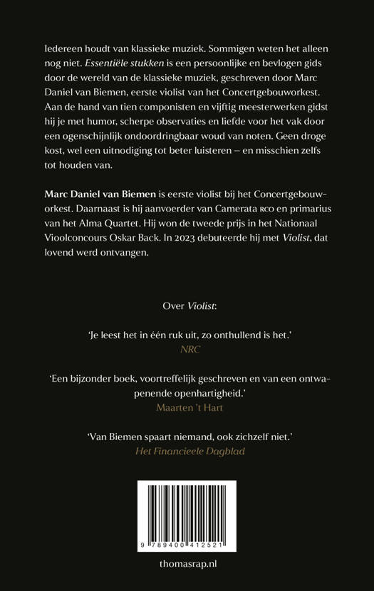 Iedereen houdt van klassieke muziek. Sommigen weten het alleen nog niet. Essentiële stukken is een persoonlijke en bevlogen gids door de wereld van de klassieke muziek, geschreven door Marc Daniel van Biemen, eerste violist van het Concertgebouworkest. Ook al bepalen algoritmes steeds meer wat we luisteren, klassieke muziek is nog altijd springlevend, zo laat hij zien. Aan de hand van tien componisten en vijftig meesterwerken gidst hij je met humor, scherpe observaties en liefde voor het vak door een ogenschijnlijk ondoordringbaar woud van noten. Geen droge kost, wel een uitnodiging tot beter luisteren – en misschien zelfs tot houden van.