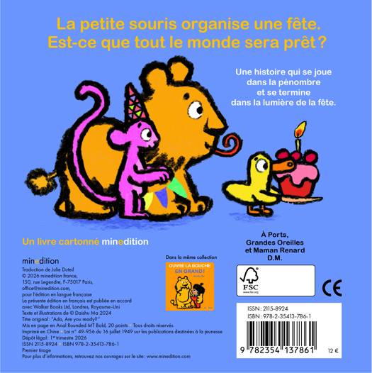 Au début, tout est noir. Avec sa lampe de poche, la souris cherche ses amis… Dans l’ombre, elle trouve le lion. Est-il prêt ? Et l’éléphant, est-il prêt lui aussi ? Car une surprise se prépare !
