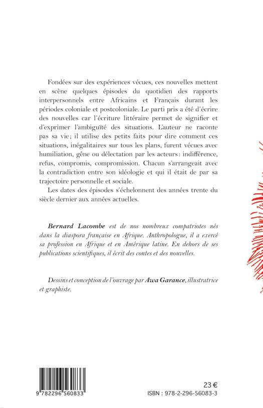Fondées sur des expériences vécues, ces nouvelles mettent en scène quelques épisodes du quotidien des rapports interpersonnels entre Africains et français durant les périodes coloniale et postcoloniale. L'auteur raconte comment certaines situations, inégalitaires sur tous les plans, furent vécues avec humiliation, gêne ou délectation par les acteurs.