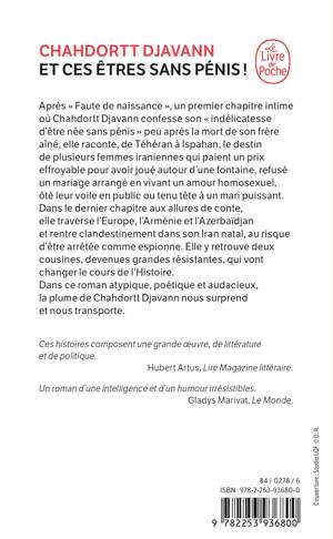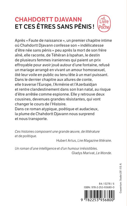 Après « Faute de naissance », un premier chapitre intime où Chahdortt Djavann confesse son « indélicatesse d’être née sans pénis » après un frère mort, elle raconte, de Téhéran à Ispahan, le destin de plusieurs femmes iraniennes qui paient un prix effroyable pour avoir joué autour d’une fontaine, refusé un mariage arrangé en vivant un amour homosexuel, ôté leur voile en public ou tenu tête à un mari puissant. Dans le dernier chapitre aux allures de conte, elle traverse l’Europe, l’Arménie et l’Azerbaïdjan et rentre clandestinement dans son Iran natal, au risque d’être arrêtée comme espionne. Elle y retrouve deux cousines, devenues grandes résistantes, qui vont changer le cours de l’Histoire.