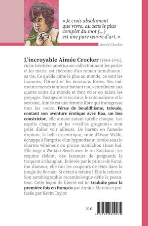 L'incroyable Aimée Crocker (1864-1941), riche héritière américaine collectionnant les perles et les maris, est l'héroïne d'un roman tumultueux : sa vie. Ce qu'elle aime le plus au monde, ce sont les hommes, l'Orient et les émotions fortes. Ses mémoires menés tambour battant nous entraînent aux quatre coins du monde et font voler en éclats les préjugés. Fustigeant le racisme, le colonialisme et le sexisme, Aimée est une femme libre qui transgresse tous les codes. Férue de bouddhisme, tatouée, contant son aventure érotique avec Kaa, un boa constrictor, elle amuse autant qu'elle choque. Les esprits chagrins et les « vieilles grognons » sont priés d'aller voir ailleurs. De harem en fumerie d'opium, la belle excentrique, amie d'Oscar Wilde, échappe à l'emprise d'un hypnotiseur, tombe sous le charme vénéneux du prince mandchou Huan Kai. Elle nage à Waikiki Beach avec le roi Kalakaua ; les requins rôdent, des lanceurs de poignards la traquent à Shanghai. Enlevée par le prince de Kutai, fou d'amour, elle fuit les coupeurs de têtes dans la jungle de Bornéo. Si c'était à refaire? Elle le referait. Son autobiographie rocambolesque défie la pesanteur. Cette leçon de liberté est ici traduite pour la première fois en français par Annick Marion et préfacée par Kevin Taylor.