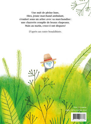Une chaude nuit d'été, Hiro, jeune marchand ambulant s'endort sous un arbre avec sa marchandise, une charrette remplie de beaux chapeaux. Mais au matin, ceux-ci ont disparu ! Des singes les ont volés ! Hiro crie. Les macaques aussi ! Il leur jette des cailloux et les singes... en font de même ! D'après un conte bouddhiste.