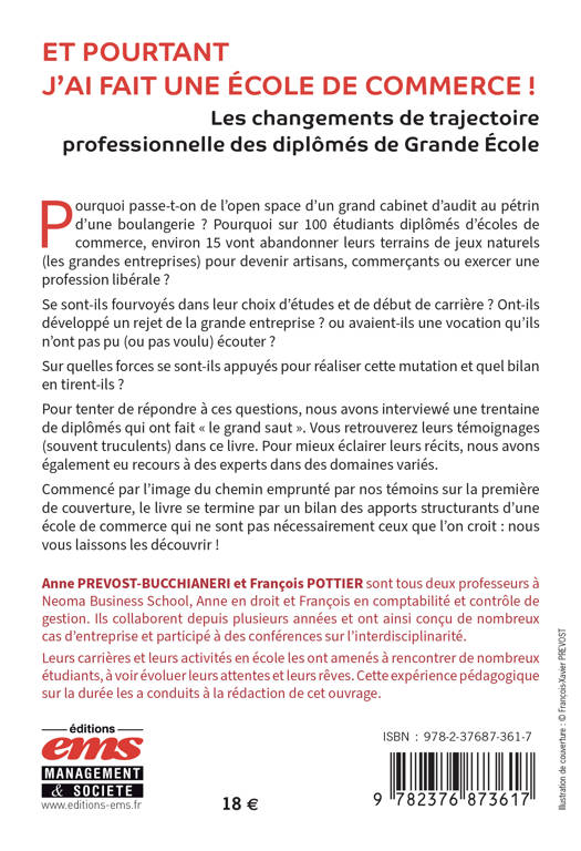 Pourquoi passe-t-on de l'open space d'un grand cabinet d'audit au pétrin d'une boulangerie ? Pourquoi sur 100 étudiants diplômés d'écoles de commerce, environ 15 vont abandonner leurs terrains de jeux naturels (les grandes entreprises) pour devenir artisans, commerçants ou exercer une profession libérale ? Se sont-ils fourvoyés dans leur choix d'études et de début de carrière ? Ont-ils développé un rejet de la grande entreprise ? ou avaient-ils une vocation qu'ils n'ont pas pu (ou pas voulu) écouter ? Sur quelles forces se sont-ils appuyés pour réaliser cette mutation et quel bilan en tirent-ils ? Pour tenter de répondre à ces questions, nous avons interviewé une trentaine de diplômés qui ont fait « le grand saut ». Vous retrouverez leurs témoignages (souvent truculents) dans ce livre. Pour mieux éclairer leurs récits, nous avons également eu recours à des experts dans des domaines variés. Commencé par l'image du chemin emprunté par nos témoins sur la première de couverture, le livre se termine par un bilan des apports structurants d'une école de commerce qui ne sont pas nécessairement ceux que l'on croit : nous vous laissons les découvrir !