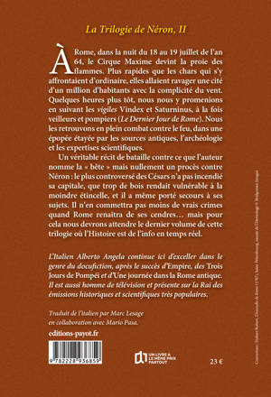 Dans la nuit du 18 au 19 juillet de l'an 64 à Rome, le Cirque Maxime devint la proie des flammes. Avec la complicité du vent, elles allaient ravager une cité d'un million d'habitants. Le premier tome de cette Trilogie de Néron nous y promenait la veille en suivant deux pompiers ("Le Dernier Jour de Rome", en poche chez Payot). Nous les retrouvons en plein combat contre le feu dans une épopée étayée par les sources antiques, l'archéologie et les expertises scientifiques. Un véritable récit de bataille, mais nullement un procès contre Néron : il n'a pas incendié sa capitale, que trop de bois rendait vulnérable à la moindre étincelle, et il a même porté secours à ses sujets. Comme toujours sous la plume du journaliste et archéologue italien, l'Histoire devient de l'info en temps réel.