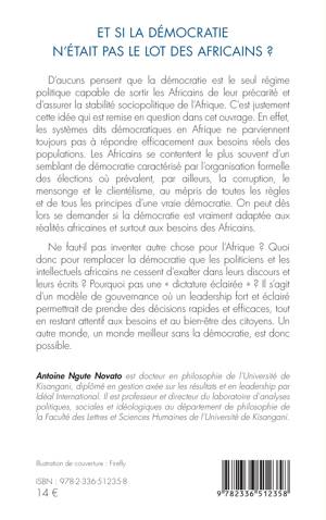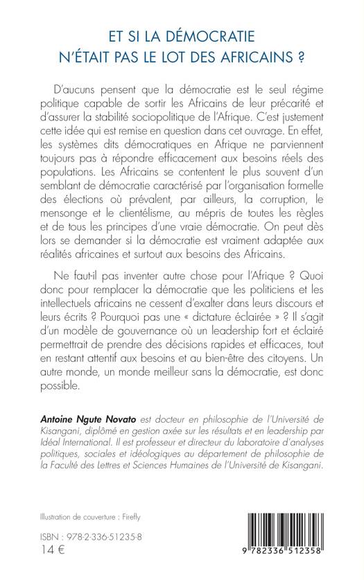 D'aucuns pensent que la démocratie est le seul régime politique capable de sortir les Africains de leur précarité et d'assurer la stabilité sociopolitique de l'Afrique. C'est justement cette idée qui est remise en question dans cet ouvrage. En effet, les systèmes dits démocratiques en Afrique ne parviennent toujours pas à répondre efficacement aux besoins réels des populations. Les Africains se contentent le plus souvent d'un semblant de démocratie caractérisé par l'organisation formelle des élections où prévalent, par ailleurs, la corruption, le mensonge et le clientélisme, au mépris de toutes les règles et de tous les principes d'une vraie démocratie. On peut dès lors se demander si la démocratie est vraiment adaptée aux réalités africaines et surtout aux besoins des Africains. Ne faut-il pas inventer autre chose pour l'Afrique ? Quoi donc pour remplacer la démocratie que les politiciens et les intellectuels africains ne cessent d'exalter dans leurs discours et leurs écrits ? Pourquoi pas une dictature éclairée ? Il s'agit d'un modèle de gouvernance où un leadership fort et éclairé permettrait de prendre des décisions rapides et efficaces, tout en restant attentif aux besoins et au bien-être des citoyens. Un autre monde, un monde meilleur sans la démocratie, est donc possible.