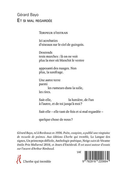 Lire un nouveau recueil de Gérard Bayo, c’est savoir qu’on entre chez un poète par une porte qui ouvre sur des secrets. Des secrets qu’il ne révèle pas, mais dont l’approche nous touche assez pour qu’on ait envie d’y voir plus loin. Et c’est avec ses propres souvenirs et avec ceux de personnes disparues, inconnues, entraperçues – un regard suffit – que le poète nous fait comprendre son humanité. Ses secrets, son secret, c’est peut-être de dire, avec une grande discrétion, l’immense compassion qu’il porte aux êtres, notamment aux modestes, aux humbles que la grande histoire s’empresse d’oublier. Sa poésie, ses mots captent ce qui est infime dans l’existence : autant un souffle dans un arbre qu’une rue qui fut traversée par un non-héros défunt. Dans la seconde partie du recueil, le poète s’adresse cette fois directement à quelqu’un, il engage un dialogue sans qu’on connaisse les réponses de l’interpellé qui n’est jamais nommé. Le poète le regarde, l’interroge, cherche son regard, cherche une compagnie, un réconfort chez l’innommé qui est peut-être un double en lui.