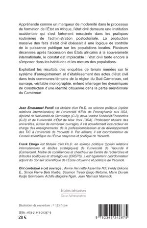 Appréhendé comme un marqueur de modernité dans le processus de formation de l’État en Afrique, l’état civil demeure une institution occidentale qui s’est fortement enracinée dans les pratiques routinières de l’administration postcoloniale. La production massive des faits d’état civil obéissait à une logique de contrôle de la puissance publique sur les populations locales. Plusieurs décennies après l’accession des États africains à la souveraineté internationale, le constat est implacable : l’état civil tarde encore à s’imposer dans les habitudes et les moeurs des populations. Exploitant les résultats des enquêtes de terrain menées sur le système d’enregistrement et d’établissement des actes d’état civil dans trois communes-témoins de la région du Sud-Cameroun, cet ouvrage interroge les dynamiques de construction d’une identité citoyenne dans la partie méridionale du Cameroun.
