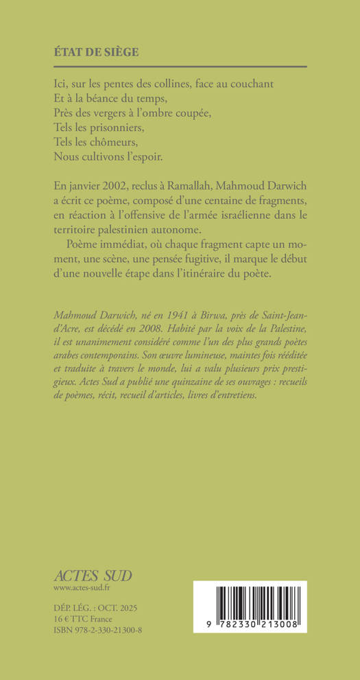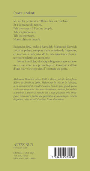 Assiégé à Ramallah, le poète note au jour le jour, en de très courts poèmes, ses impressions sur une guerre de plus en plus atroce.