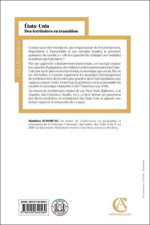 Connue pour être énergivore, peu respectueuse de l’environnement, dépendante à l’automobile et aux énergies fossiles, la première puissance du monde a-t-elle les capacités de s’adapter aux multiples transitions qui l’attendent ? Par une approche volontairement transversale, cet ouvrage analyse les capacités d’adaptation, de résilience et de transformation des États-Unis tant sur le plan environnemental, économique que mobilitaire. Par un jeu d'échelles, il interroge également les stratégies d’aménagement des territoires très divers (des plus grandes aires métropolitaines aux espaces ruraux). Au travers de nombreuses études de cas appuyées sur une iconographie riche (New York, Baltimore, Chicago, Los Angeles, San Francisco, Seattle, etc), ce livre dresse un panorama des divers territoires américains en transition(s) et apporte une lecture nuancée et renouvelée des États-Unis.