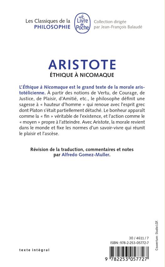 Oeuvre de maturité, l'Ethique à Nicomaque est le grand texte de la morale aristotélicienne. A partir des notions de Vertu, de Courage, de Justice, de Plaisir, d'Amitié, etc., le philosophe définit l'architecture d'une sagesse à « hauteur d'homme » qui renoue avec l'esprit grec dont Platon s'était partiellement détaché. Le bonheur apparaît comme la « fin » véritable de l'existence, l'action étant alors le