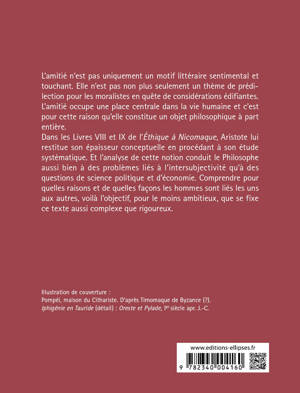 Dans les Livres VIII et IX de l’Éthique à Nicomaque, Aristote lui restitue son épaisseur conceptuelle en procédant à son étude systématique. Et l’analyse de cette notion conduit le Philosophe aussi bien à des problèmes liés à l’intersubjectivité qu’à des questions de science politique et d’économie. Comprendre pour quelles raisons et de quelles façons les hommes sont liés les uns aux autres, voilà l’objectif, pour le moins ambitieux, que se fixe ce texte aussi complexe que rigoureux.