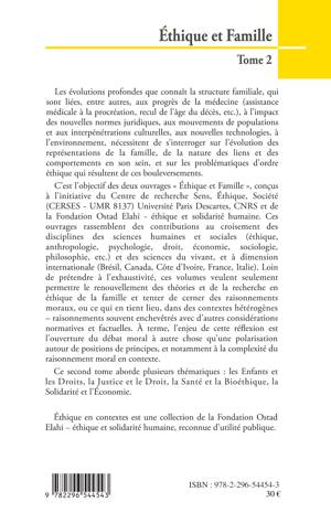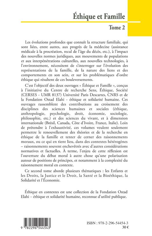 Les évolutions profondes que connaît la structure familiale nécessitent de s'interroger sur l'évolution des représentations de la famille, de la nature des liens et des comportements en son sein et sur les problématiques d'ordre éthique qui résultent de ces bouleversements. Ce second tome aborde plusieurs thématiques : les Enfants et les Droits, la Justice et le Droit, la Santé et la Bioéthique, la Solidarité et l'Economie.