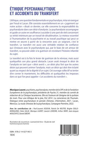 L'éthique, une question fondamentale en psychanalyse, mise en exergue par Freud et Lacan. Elle consiste essentiellement en un « jugement sur notre action » disait ce dernier, car elle concerne la responsabilité du psychanalyste dans son désir d'analyste. Le psychanalyste accompagne et guide un autre en souffrance à accéder à une part de réel concernant sa vérité intérieure par un travail de désaliénation. Le moteur essentiel à l'humanisation de la psychiatrie et au travail psychique qui peut se mettre en uvre à partir de la rencontre avec un soignant, c'est le transfert. Le transfert est aussi une véritable relation de confiance qui s'instaure avec le psychanalyste qui, par le biais de cet amour de transfert, va pouvoir aider à la guérison en revisitant l'histoire infantile du sujet. Le transfert est à la fois le levier de guérison de la névrose, mais aussi quelquefois son plus grand obstacle. Lacan avait évoqué le désir de l'analyste en tant que « désir averti », un désir plus fort que les autres désirs qui peuvent animer l'analyste, mais un désir qui doit être éclairé quant au respect de la dignité d'un sujet. Cet ouvrage collectif va tenter d'en cerner le maniement, les difficultés et quelquefois les impasses dans ce que l'on peut appeler « Les accidents du transfert ».