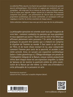 La philosophie spinoziste est orientée avant tout par l’exigence de vivre bien : comment combattre les passions qui nous possèdent et nous opposent aux autres ? Quels sont les Joies et les Désirs qui affirment pleinement notre puissance ? En vérité, ces questions pratiques ne peuvent être posées que si d’abord est comprise la situation de l’homme au monde. Il faut savoir ce qu’il en est de l’Être, et de toute chose existant en lui, pour comprendre comment l’homme peut sortir de la passivité, et accéder à une réelle activité. Ainsi, en suivant une exposition systématique (selon « l’ordre géométrique »), l’Éthique développe une pensée de l’intelligibilité intégrale de la Nature, conçue comme productivité infinie dont chaque chose est une expression singulière. La tâche de Spinoza est de montrer la positivité entière de cette constitution de la Nature par elle-même. La nôtre sera d’introduire à cette philosophie de la puissance en acte.