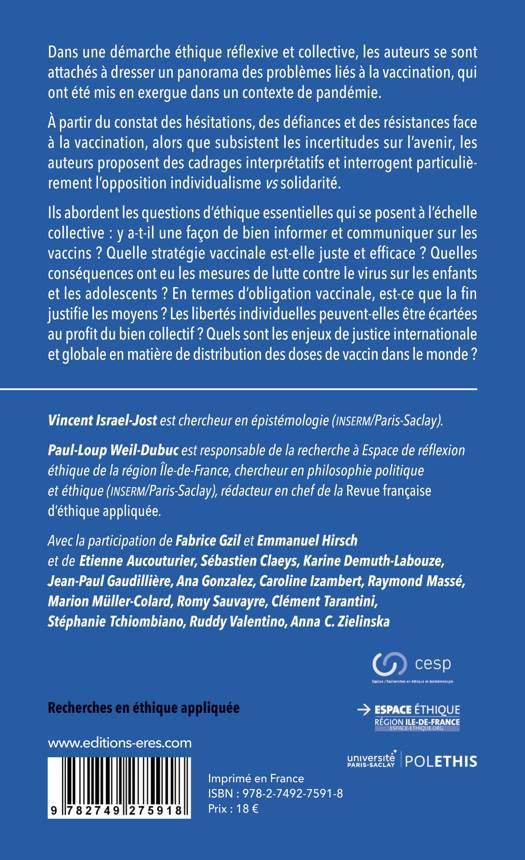 A partir du constat des hésitations, des défiances et des résistances face à la vaccination, dans un contexte où les incertitudes sur l’avenir persistent, les auteurs proposent des cadrages interprétatifs et interrogent particulièrement l’opposition individualisme vs solidarité. Ils abordent les questions d’éthique essentielles qui se posent à l’échelle collective : y a-t-il une façon de bien informer et communiquer sur les vaccins ? Quelle stratégie vaccinale est-elle juste et efficace ? Quelles conséquences ont eu les mesures de lutte contre le virus sur les enfants et les adolescents ? En matière d’obligation vaccinale, est-ce que la fin justifie les moyens ? Les libertés individuelles peuvent-elles être écartées au profit du bien collectif ? Quels sont les enjeux de justice internationale et globale de distribution juste des doses de vaccin dans le monde ?