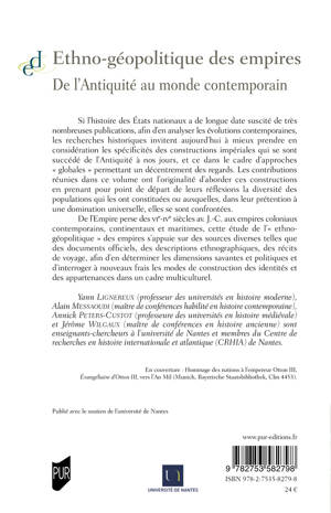 De l'Empire perse des VIe-IVe siècles av. J.-C. aux empires coloniaux contemporains, continentaux et maritimes, cette étude de l'"ethno-géopolitique" des empires s'appuie sur des sources diverses telles que des documents officiels, des descriptions ethnographiques, des récits de voyage, afin d'en déterminer les dimensions savantes et politiques et d'interroger à nouveaux frais les modes de construction des identités et des appartenances dans un cadre multiculturel.